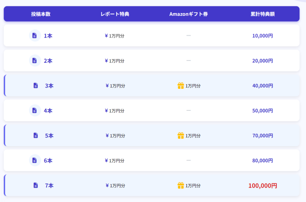 レポート1本につき1万円分のレポートに加え、レポート投稿数が3本・5本・7本のさいにAmazonギフト券1万円分をプレゼントとさせて頂きます。